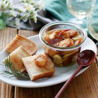 ガラス瓶に詰められ、トーストを添えたホタテときのこのオイル漬け
