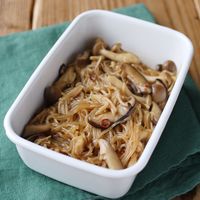 白い保存容器に盛られた、きのことしらたきのピリ辛煮