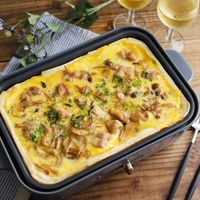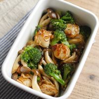 琺瑯容器に入れたホタテときのこのアヒージョ風炒め