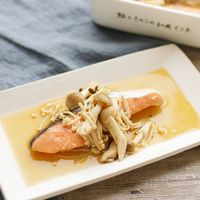 白い長方形の皿に盛られた、鮭ときのこの和風マリネ