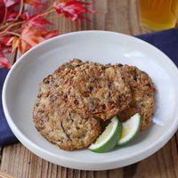 白い皿に盛られ、すだちを添えたきのこで作るがんもどき