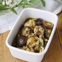 白い保存容器に盛られた、3種きのこのオイル蒸し