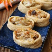 紺色の長方形の皿に盛られ、七味唐辛子をトッピングしたきのことチーズ入りの油揚げ巾着