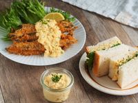 カツサンドや揚げ物にたくあんタルタルがのっている様子