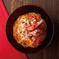 皿に盛られたカニトマトクリームパスタ