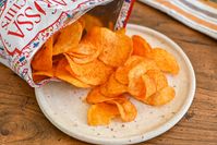お皿にのったカルディコーヒーファームのオリジナル ハリッサポテトチップス