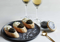 シャンパンと「キャビアのブルスケッタ」がが置いてある