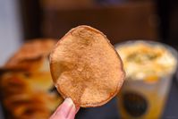 OIMOティーシェイクにさつまいもチップス 塩バター仕立てをつけているところのアップ