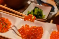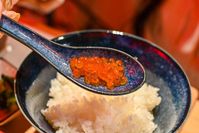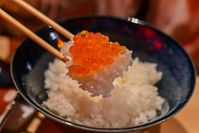 シラリカいくらをのせたご飯を箸で持ち上げているところ