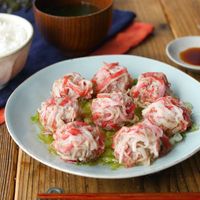 カニカマをまぶしたしゅうまいが皿に盛られている