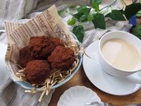 青い器に盛られたチョコ餅とカップに入ったホットドリンク