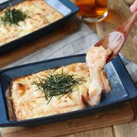 ブルーの器に盛られた餅入りもちもち明太マヨグラタン