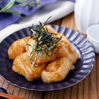 濃い色合いの器に盛られた揚げ餅