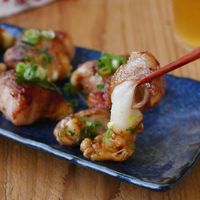 青い器に盛られた餅チーズ豚巻きを箸で持ち上げる様子