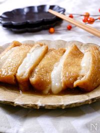 茶色い器に盛られたいなり餅