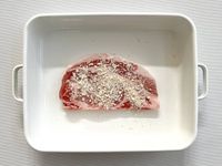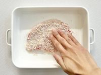 豚ロース肉に「ラク揚げパン粉」を振りかけた様子