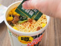 カップヌードル 酸辣湯 ビッグに酸辣湯用特製香味油を入れる様子