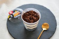 チョコレート菓子ののったカップ入りティラミスと金のスプーン