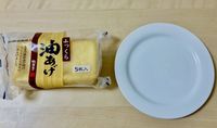 テーブルに油揚げの袋と皿が置かれている