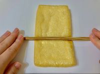 まな板に置かれている油揚げの上で、菜箸を転がしている
