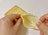 半分に切った油揚げの切り口を手で広げている