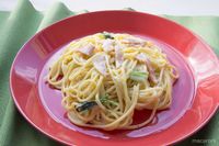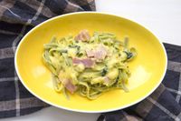 お皿に盛ったほうれん草とベーコンのカルボナーラ