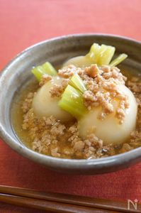 木製のテーブルと和風の器に盛られたかぶと鶏そぼろのとろとろ煮