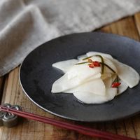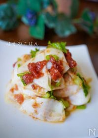 白くて四角い器に盛られたかぶと梅のおかか和え