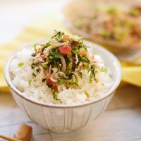 茶碗に盛られた白米とカブの葉と梅の春色ふりかけ