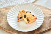 木のカッティングボードと白い皿にのったチョコチップスコーン
