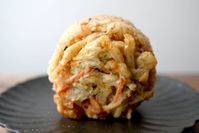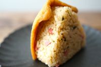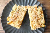 「最強どん兵衛 かき揚げむすび」を半分に割った様子