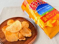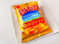 「湖池屋 ポテトチップス金のコンソメ」のパッケージと中身が並んでいる様子