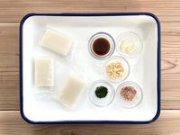 バットの上に餅、ソース、マヨネーズなどが並んでいる