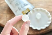 木のカッティングボードと白い小皿にのった白いパッケージのシュガーレスのど飴を手に持つ様子