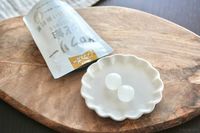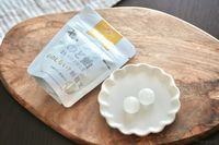 木のカッティングボードと白い小皿にのった白いパッケージのシュガーレスのど飴