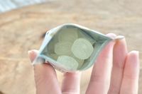 木のカッティングボードにのった白いパッケージのシュガーレスのど飴の袋の中身