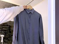 しわしわになったシャツを浴室に吊るしている様子