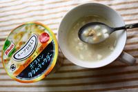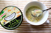 ベーコンとポテトがたっぷりポタージュのパッケージとカップで作ったスープ