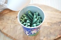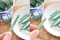 木のカッティングボードにのった青いシーフードじゃがりこの中身