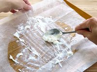 「蒸しシート」にこびりついたヨーグルトをスプーンで取っている様子