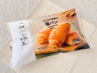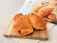 「塩パン3個入」のパッケージとパンが並んでいる様子