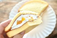 木のカッティングボードにのったフルーツサンドと手で持つ様子