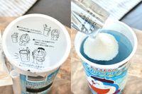 木のカッティングボードにのった映画ドラえもんコラボのゼリードリンクの内蓋とドリンクにパウダーをかける様子