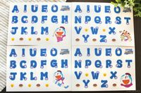 木のカッティングボードにのった映画ドラえもんコラボのオリジナルステッカーとストライプの布