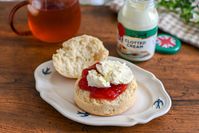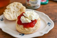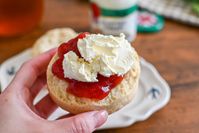 ジャムとクロテッドクリームをのせたスコーンを持っているところ