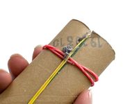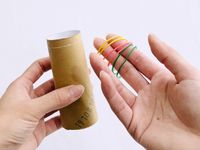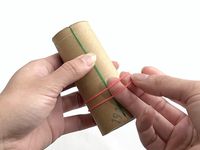 トイレットペーパーの芯に輪ゴムをはめている様子