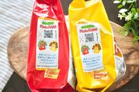 木のカッティングボードにのった赤と黄色の端午の節句限定パッケージのキャラメルコーンとパッケージ側面のQRコード