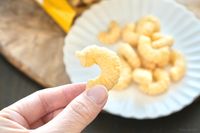 木のカッティングボードと白い皿にのったプリン味の黄色いキャラメルコーンを手に持つ様子