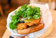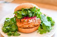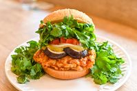 パクチーを添えたバーガーのアップ