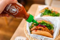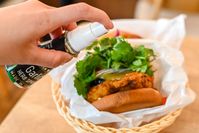バーガーにソースをかけているところ